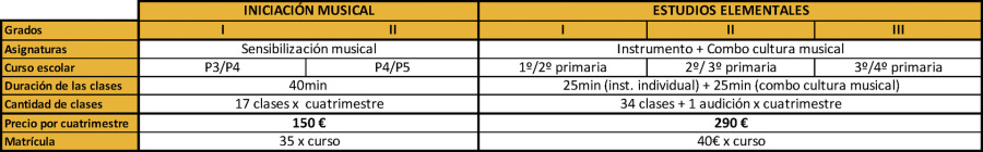 En el Programa de Estudios Elemental ya se incorporan las clases individuales de instrumento, que será de libre elección por parte de los alumnos, eligiendo entre guitarra, bajo eléctrico, batería, piano, canto, trompeta y trombón. Las clases de Cultura Musical serán grupales, en formato de banda (Combo) e incluyen el contenido de teoría musical transmitidos a través de actividades prácticas y divertidas.